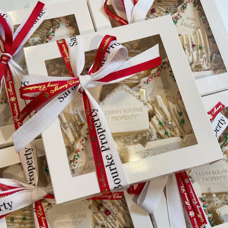 Our medium box filled with 12 mixed size imprinted OR printed logo & Christmas themed cookies – finished with a ribbon bow.